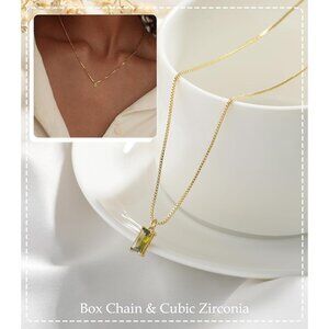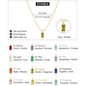 The birthstone necklace consists of 12 colors of cubic zirconia(0.4cm*0.8cm) and 14K gold plated box chain without nickle and lead, hypoallergenic. Generous and simple designs will never go out of style.