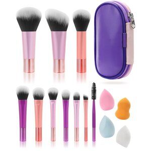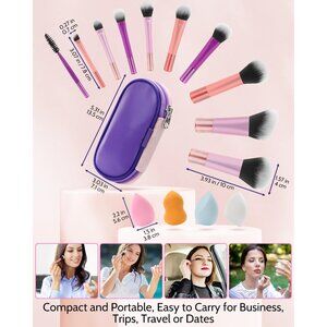 Mini Makeup Brush Travel Set: 1 set includes 10 brushes, such as eyeshadow brush, powder brush, highlighter brush, blush brush, lip brush, eyebrow brush, and mascara brush, along with 4 makeup sponges, meeting your daily, outdoor, work, and travel makeup needs