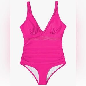 hot pink swimsuit, mesh panel one-piece, V-neck bathing suit, tummy control swimwear, women’s flattering swimsuit, resort swimwear, vacation swimwear, sexy one-piece, ruched waist swimsuit, bold color swimwear, adjustable straps bathing suit, full back coverage swimsuit, summer beachwear