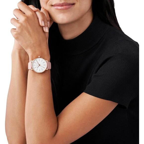 Watch Band: Genuine blush pink leather band with adjustable buckle closure; 18mm band width