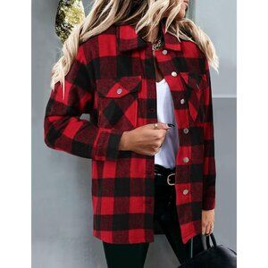 Women Plaid Red Collared V Neck Button Down Oversized Long Sleeve Shirt Top