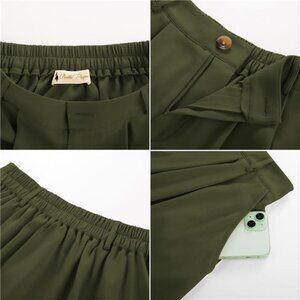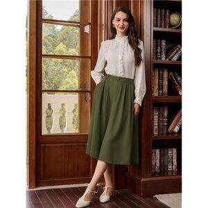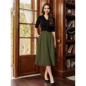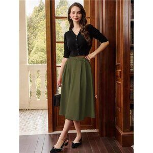 Women Pleated Skirt with Pockets A Line Green