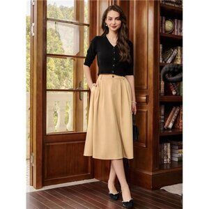 Elegant Design: This inspired A-line skirt features a flattering high waist design with elastic back waistline for comfortable all-day wear, complete with front zip closure and button detail for a classic look.