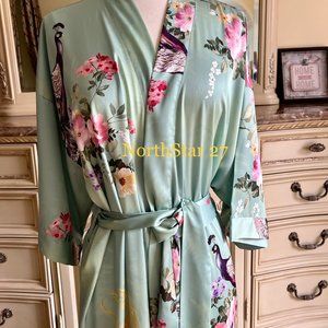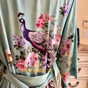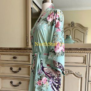 This robe is one size fits most regular and plus size ladies. The robe is soft and silky that is perfect for daily wear, lounging, or layering. It would be a fabulous choice for pajama parties, bridal showers, bachelorette parties, or any special occasion with your significant other. The fabric gives you a luxurious feel, it is lightweight and silky to the touch. The Soft mint green tone with lucky peacock and beautiful flowers print brings visual relaxation and soothes your body. This robe is secured with a tie inside and the robe tie is secured with loops on each side. Please be sure to ask any questions you may have before purchasing. Thanks for visiting our shop. Be well and stay healthy!! Bust-54" Length-50"