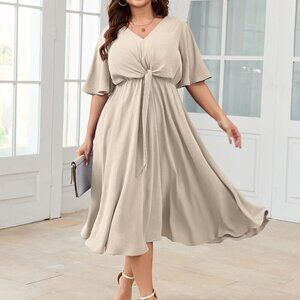 Women Plus Size Midi Dresses Wedding Guest Short Sleeve V Neck Tie Waist Casual