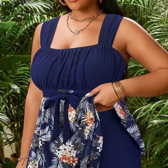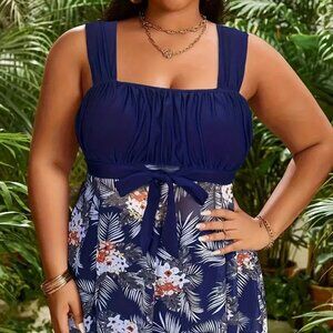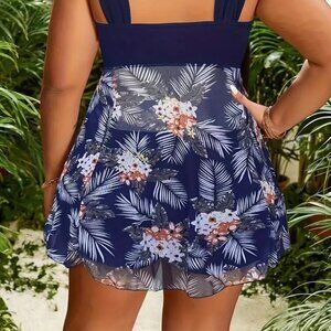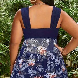 Brand New Women Plus Size Tropical Tankini Set - Elegant Off-Shoulder Swim Dress with Mesh Detail, Adjustable Tie & Removable Pads Available in 16W 20W and 22W