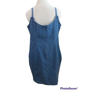 Derek & Heart Women plus size 2X Blue Jean Denim Bodycon Dress T Strap Knee Length Full Zipper Cotton This dress is in very good condition ( see Photos) dress measurement is in description. Size - 2X, Length- 38" armpit to armpit: 20" waist: 38" Hips: 42"