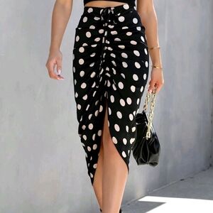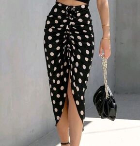 Women Polka Dot Print Drawstring Ruched Split Thigh Skirt