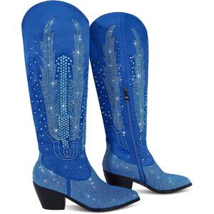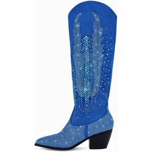 Women Polyurethane Blue Knee High Rhinestone Bling Pointed Toe Cowgirl Western