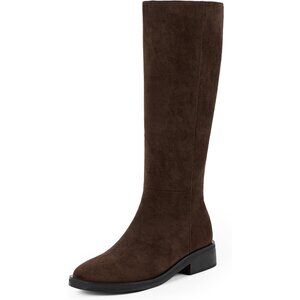 Women Polyurethane Suede Chocolate Round Toe Flat Side Zipper Knee High Boots