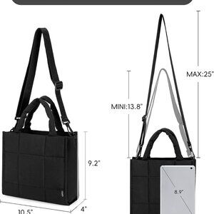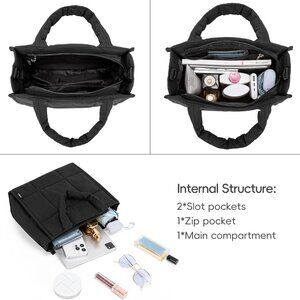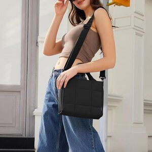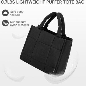 Features: Made from high-quality nylon with a quilted, puffy design, this tote is lightweight at just 0.75 pounds. It offers plenty of room for your daily essentials—iPad, water bottle, wallet, cosmetics, and more—and has a zipper closure for extra security. Inside, you'll find a zip pocket and two open pockets for organization. The adjustable strap and comfortable handles make it easy to carry as a handbag, shoulder bag, or crossbody.