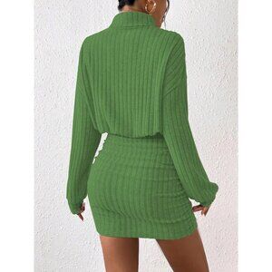 Women Pullover Light Green Sweater Dress Lantern Sleeve Turtleneck Ribbed Mini