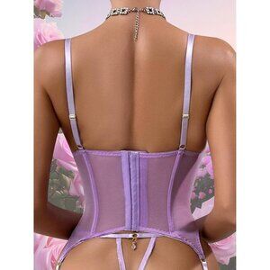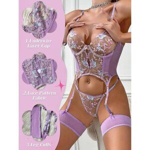 🆕Women Purple Sexy Corset Teddy Lingerie 3 Piece with Garter Belt Lingerie Sets