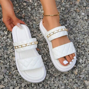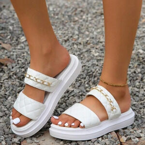 Women Quilted Chain Decor Flat Sandals, Fashion White Slide Sandals