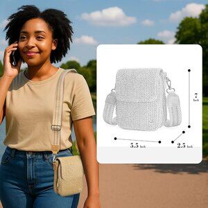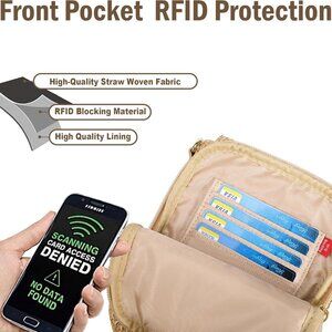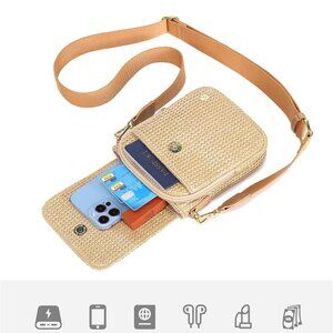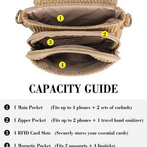 Features: Crafted from woven straw with soft lining and sturdy stitching, this cute crossbody is super breezy and beach-ready. It has 4 RFID-blocking card slots for added security, a magnetic phone pocket, two main compartments for your passport, keys, or makeup, plus a back zip pocket for valuables. The adjustable strap makes it easy to wear crossbody or shoulder, and it’s just the right size for your essentials.