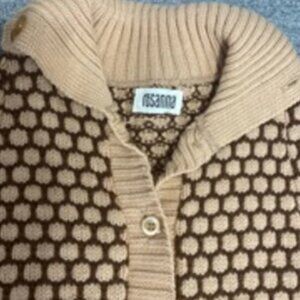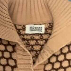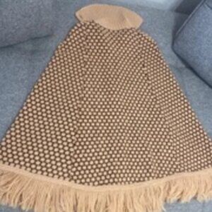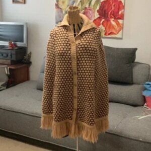 VTG- Pre-owned TOXANNA knit poncho. Features a brown and beige geometric pattern, a high collar, button front closure, and fringe trim. The material appears to be a wool blend. Approximate dimensions are not provided. Shows no significant flaws; condition is good. The item is pre-owned and may show minor signs of wear consistent with use. Brand: ROXANNA. Model: Not specified. measurements 32”long