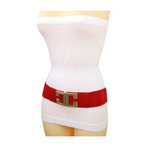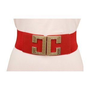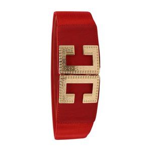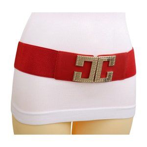 Women Red Elastic Hip High Waist Fashion Belt Big Gold Metal C Buckle Size S M