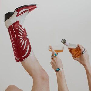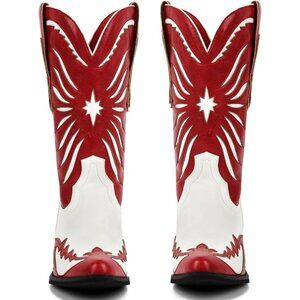 ⚡Women Red Faux Leather Mid Calf Knee High Pointed Toe Western Cowgirl Boots