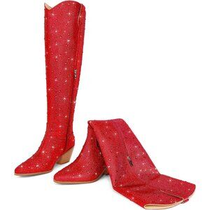 Women Red Faux Leather Sparkly Bling Rhinestone Over the Knee Cowboy Pull-OnBoot