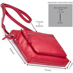 8”Height x 10.5" Length x 1.75” Width. Multi-purpose Zip Pockets, 5 Zipper pockets(1 Main zipper, 2 Front zipped pocket, 1 inside hidden zip pocket and 1 back zip pocket) Easy to take Mini iPad (7.9" Screen Size or Lower) , lipsticks, sun cream, cell phone, car keys, small makeups, check book wallet case, charger, etc. Strong shoulder strap (2-layer design, both is leather), strap lengths about 51 inches(including the buckles), fully adjustable.