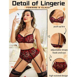 Women Red Lingerie Set High Waisted Underwire Lingerie With Garter Belt Lace