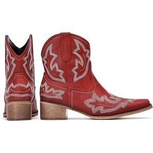 Eye-Catching Embroidery: This red cowgirl country boots is designed to white line embroidery on the mid-calf and vamp. The embroidery design adds a touch of elegance to these ankle booties, making them a fashionable choice for any occasion.