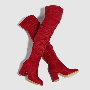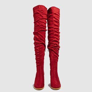 Women Red Suede Leather Pull On Side Zipper Chunky Block Heel Thigh High Boots