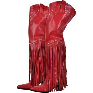 Women Red Synthetic Fringe Thigh High Tassels Wide Calf Over Knee Pointed Boots