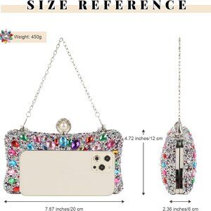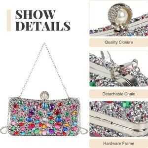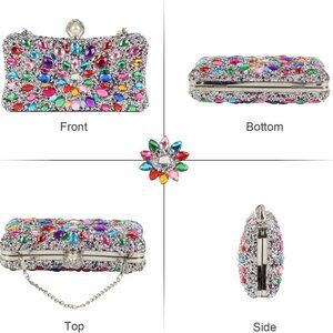 Features: Crafted from multicolored sparkling crystals on sturdy leather, this clutch shines with a stunning, eye-catching design. It features a clasp closure and can be styled as a clutch, crossbody, or single shoulder bag, thanks to the two detachable chain straps. Sized at 7.87 x 2.36 x 4.72 inches with enough room for your phone, lipstick, keys, sunglasses, and a few makeup essentials.