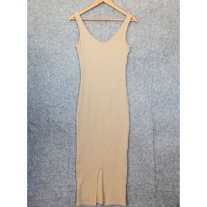 Women Ribbed Knit Midi Bodycon Dress XS Beige Slit Summer Cocktail Vacay LIONESS