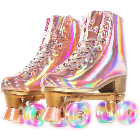 The classic double-row roller skates will always be around to pay homage to roller skating roots. The 1-inch heels and timeless retro design will keep you looking great as you skate. Classic double-row roller derby skates are safer and more stable than inline roller blades, ideal for beginners and women or men who want to easily learn roller skating. Holographic rose gold with pink is a super cool color.