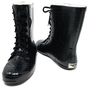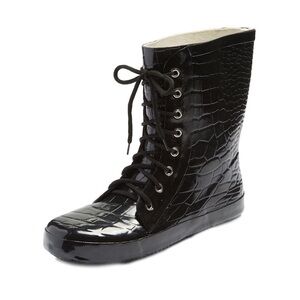 Women Rubber Rain Boots, 11" Black Crocodile Laces Booties Rainboots