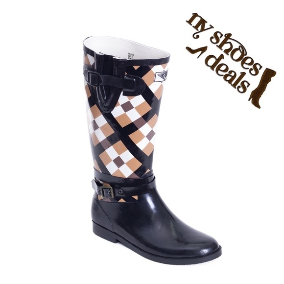 Women Rubber Rain Boots, Brown Checkers Garden Rainboots
