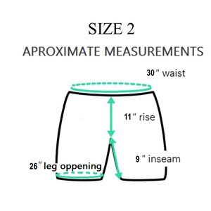 Size 2 Waist 30 in - Leg opening 26 in - Rise 11 in - Inseam 9 in