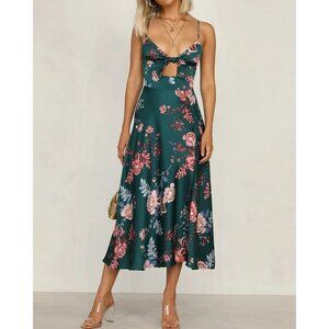 Women Satin Midi Dress Floral Tie Front Backless Split Boho Casual