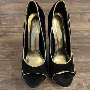 Women Sexy Velvet Black And Gold Open Toed Platform Stilettos Heels. Size 8
