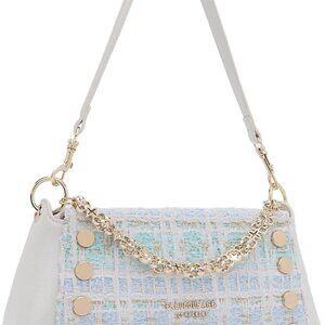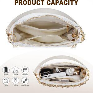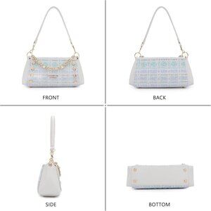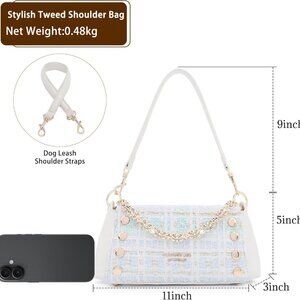 Features: Trendy design featuring a chic golden chain and hand-mounted studs, adjustable detachable strap for multiple styles—shoulder, handbag, clutch. Crafted from a mix of tweed and vegan leather, with a soft polyester lining. Spacious enough to hold your daily essentials like phone, wallet, and cosmetics, with a zip-around closure for added security. The perfect blend of fashion and function for any occasion.