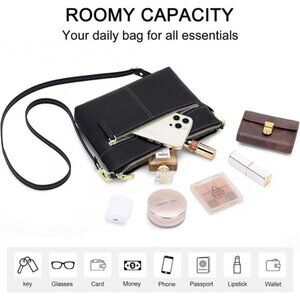 Size & Organized Design:This women trendy purse measures 9" x 1.5" x 6.5"( L x W x H ). It has 4 Pockets, including 1 front zipper pocket, 1 main compartment, 1 inner slip pocket and 1 inner zipper pocket. 6 Card Slots with RFID blocking protection for cards. Safely holds and organize smartphones, passports, cash, glasses, large wallets, cosmetics, and other small essentials