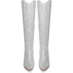 Women Silver Faux Leather Sparkly Bling Rhinestone Over the Knee Cowboy Boot
