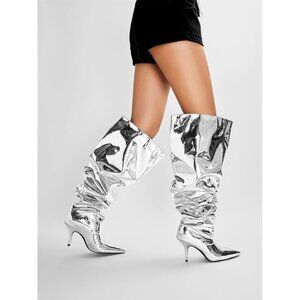 🆕Women Silver Faux Leather Wide Calf Thigh High Heeled Stiletto Cone Heel Boot