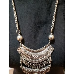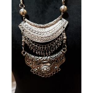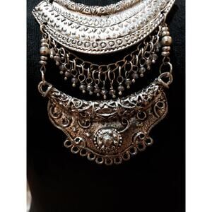 Women Silver Statement Bib Necklace Vintage Boho Layered Metal Chain Pendant