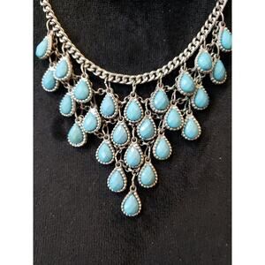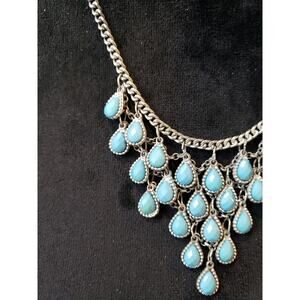 Women Silver Tone Teardrop Bazel-set Blue Bubble Beads Crochet Link Bib Necklace.