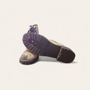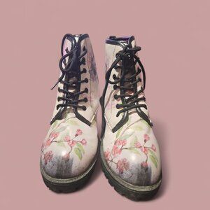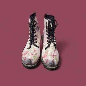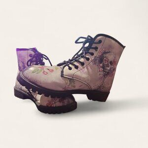 The Women Skull and Roses Combat Ankle Boots in size 10 feature a round toe shape, lace-up closure, and low heel height, making them perfect for various occasions such as travel, parties, and casual wear. Made of faux leather with a skull and roses pattern, these vegan boots feature lace-up accents and are perfect for the fashion-forward woman seeking to make a statement. The ankle shaft style and block heel design contribute to the overall stylish look of these combat boots, making them suitable for all seasons. (Boots are gently used)