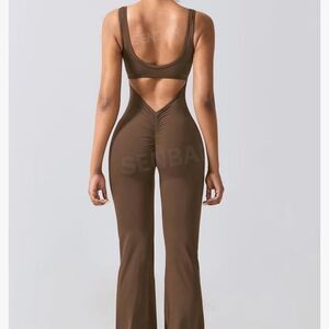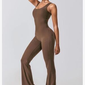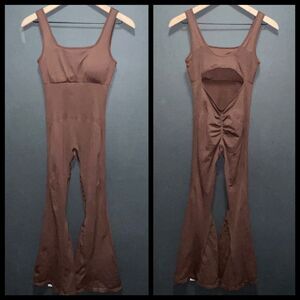 Women Sleeveless Flare Jumpsuits Backless Romper V Back Medium Brown
