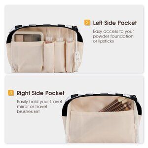 MULTIPLE STORAGE COMPARTMENTS - One main compartment with 5 small pockets neatly organizes your makeup. Main pocket in decent size holds many small items. Left side pockets hold your concealer or lipsticks, while right side easily holds your travel mirror or travel brushes set
