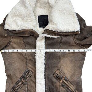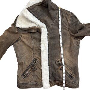 Women Small Sherpa Lined Faux Leather Aviator Bomber Jacket Brown Winter