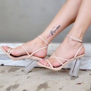 Women Square Toe Clear Block High Heel Sandals Nude Color