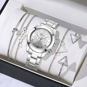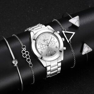 Women Stainless Steel Watch Geneva Quartz & 4 Piece Bracelet Silver NWT