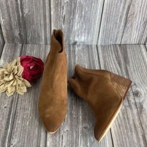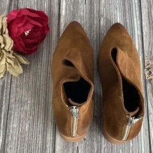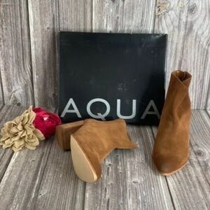 NIB Aqua Women's Tan/ Brown Suede Leather Pointed Toe Dante Booties Size 9.5 Pointed toe Back zip closure Stacked heel 3.5" Heel Height Dante style name ***New in box but shows minor scuffs and signs of trying on and handling.