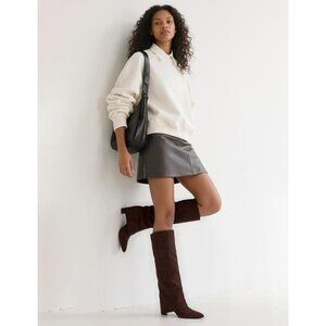 Women Suede Chocolate Faux Leather Fold Over Knee High Chunky High Heels Boot